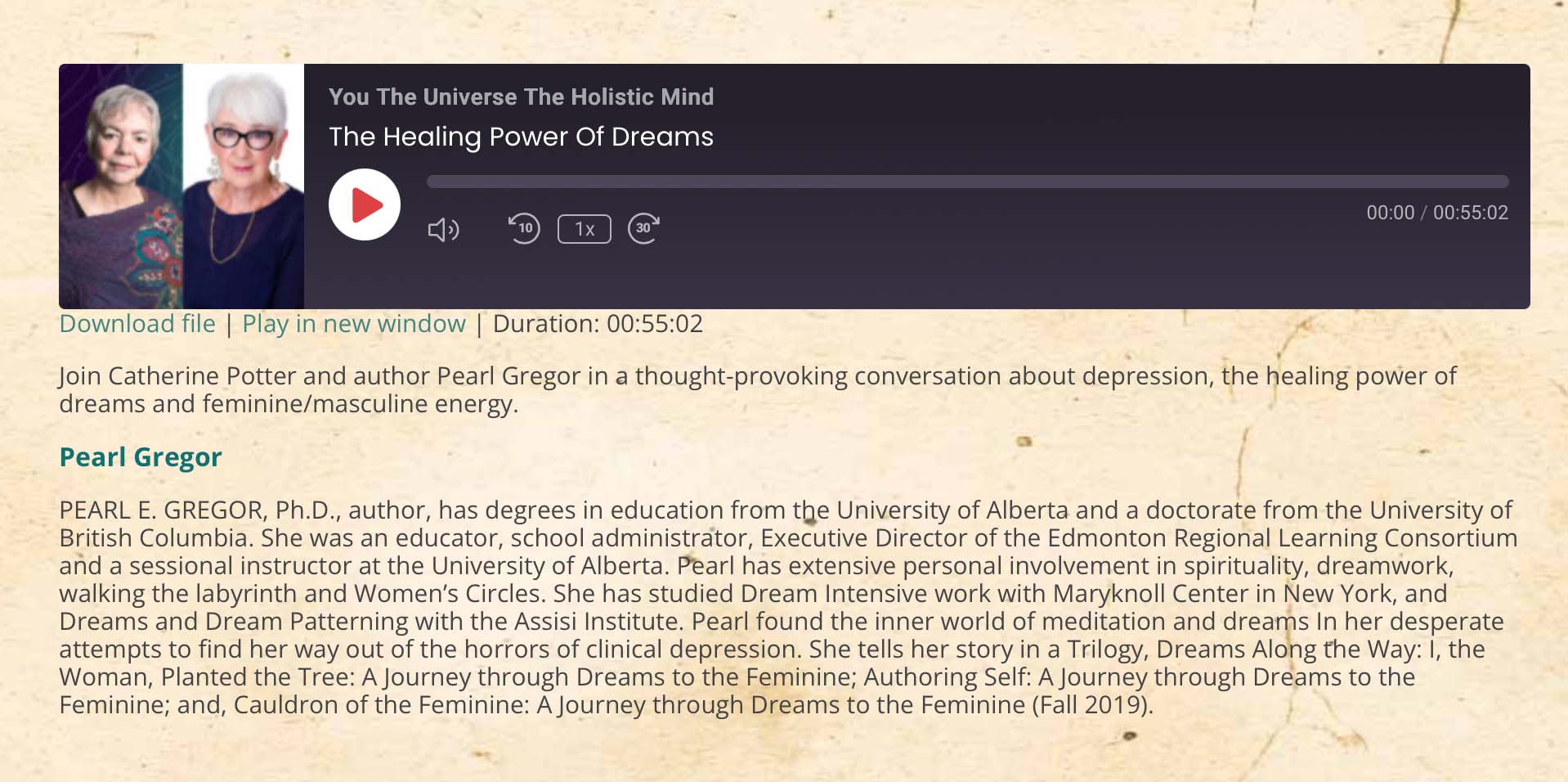 Join Catherine Potter and author Pearl Gregor in a thought-provoking conversation about depression, the healing power of dreams and feminine/masculine energy.